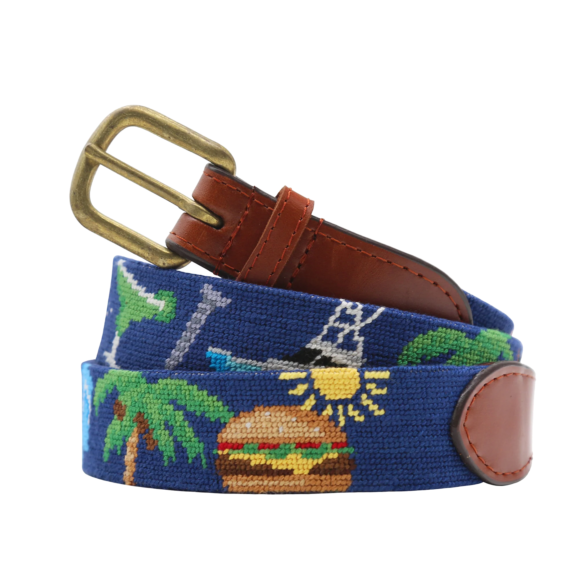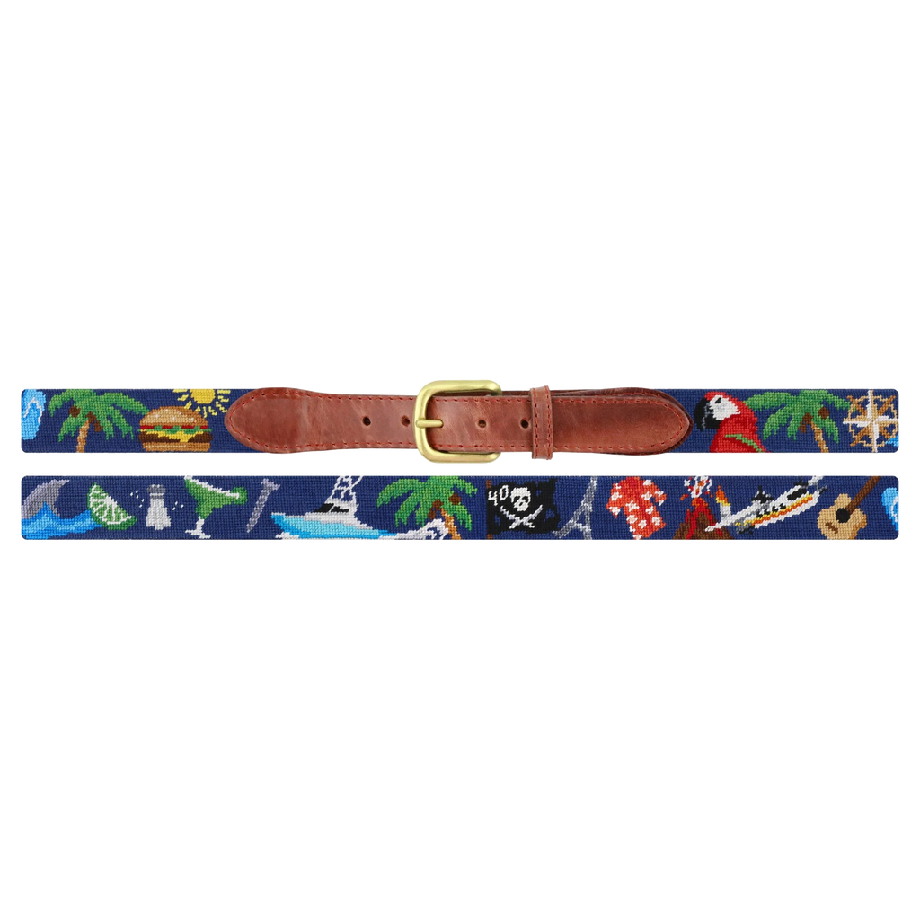 Our Cheeseburger in Paradise needlepoint belt, partnered with Smathers and Branson creates a fun, iconic belt with style. Show off your favorite things in life with our iconic needlepoint belts! As elegant as they are casual, our belts are the perfect accessory to help you stand out from the crowd. Our 100% hand-stitched belt measures 1.25" in width and is lined with full grain, Italian leather and is finished with a solid brass buckle. Each belt is packaged in a handmade wooden gift box. -100% hand-stitched needlepoint -Stitched with French cotton thread -Lined with full grain Italian leather -Finished with a solid brass buckle -1.25” in width