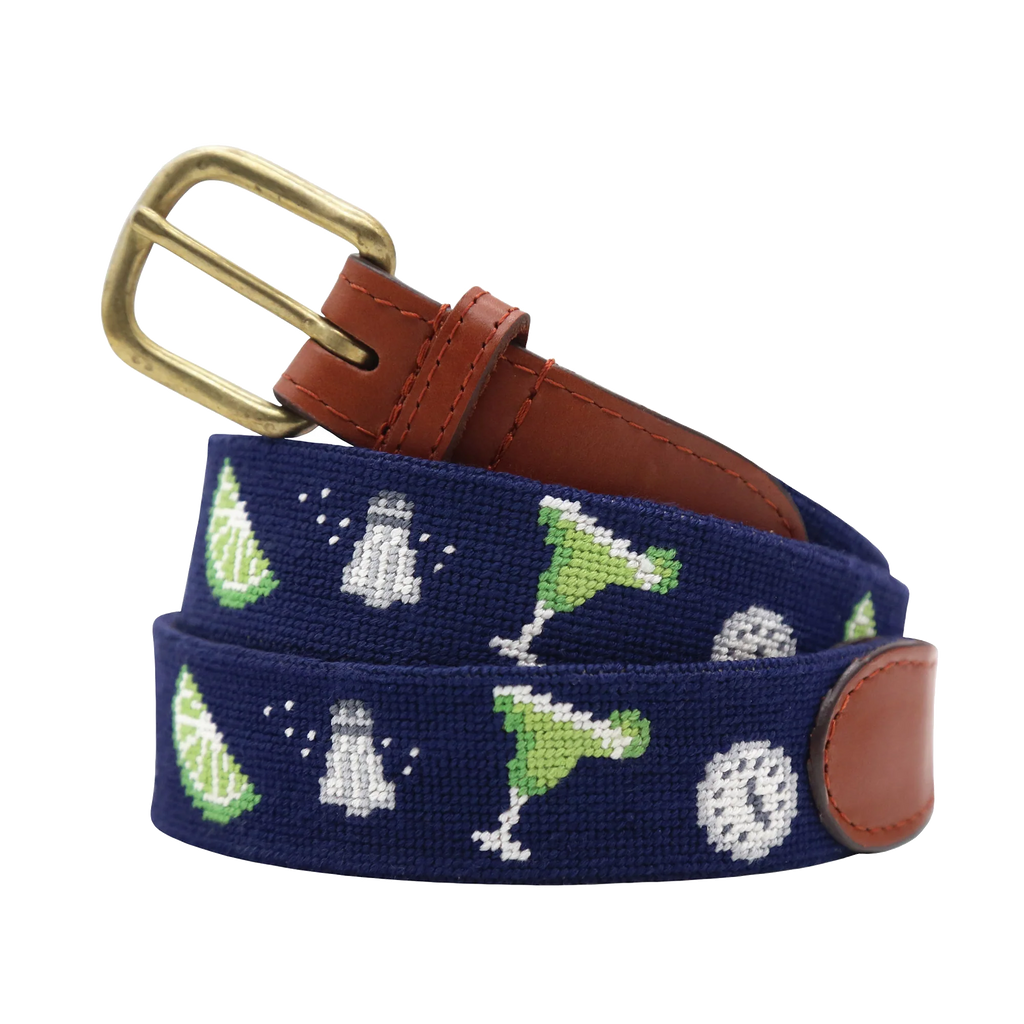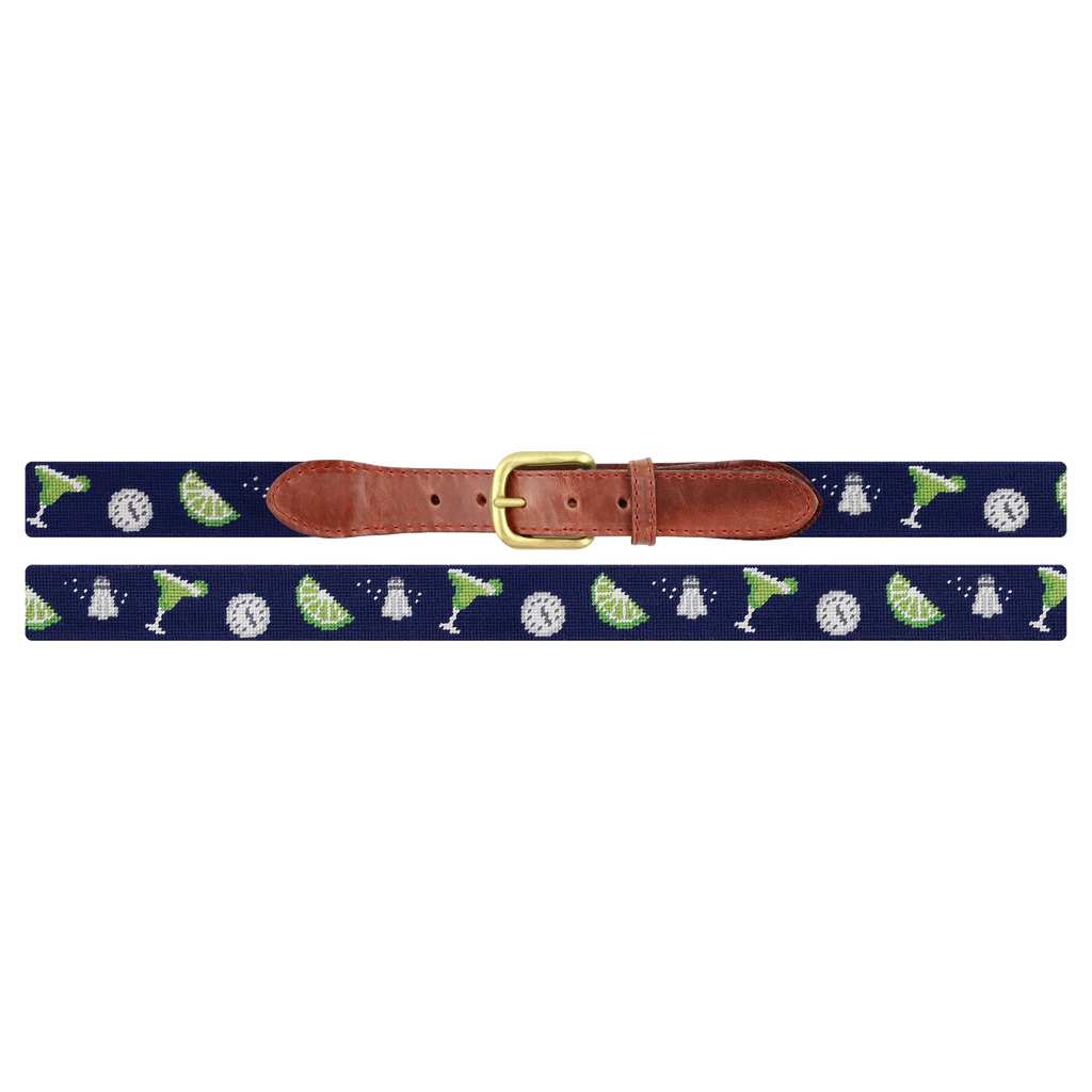 It's 5:00 Somewhere, and our needlepoint belt, partnered with Smathers and Branson is decorated with our iconic, lime wedge, salt shaker, margarita glass, and clock (that is always on 5).