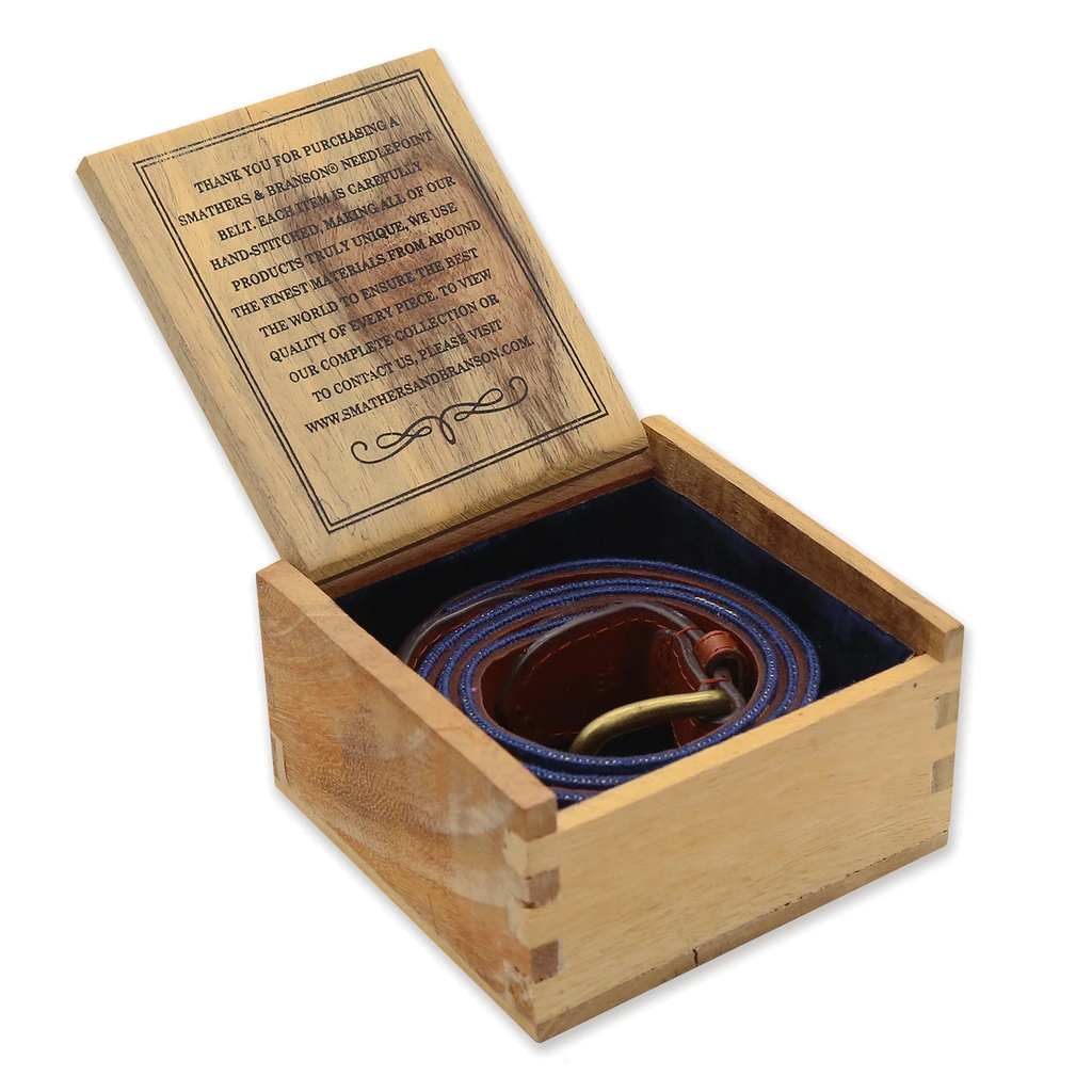 Show off your favorite things in life with our iconic needlepoint belts! As elegant as they are casual, our belts are the perfect accessory to help you stand out from the crowd. Our 100% hand-stitched belt measures 1.25" in width and is lined with full grain, Italian leather and is finished with a solid brass buckle. Each belt is packaged in a handmade wooden gift box. -100% hand-stitched needlepoint -Stitched with French cotton thread -Lined with full grain Italian leather -Finished with a solid brass buckle -1.25” in width