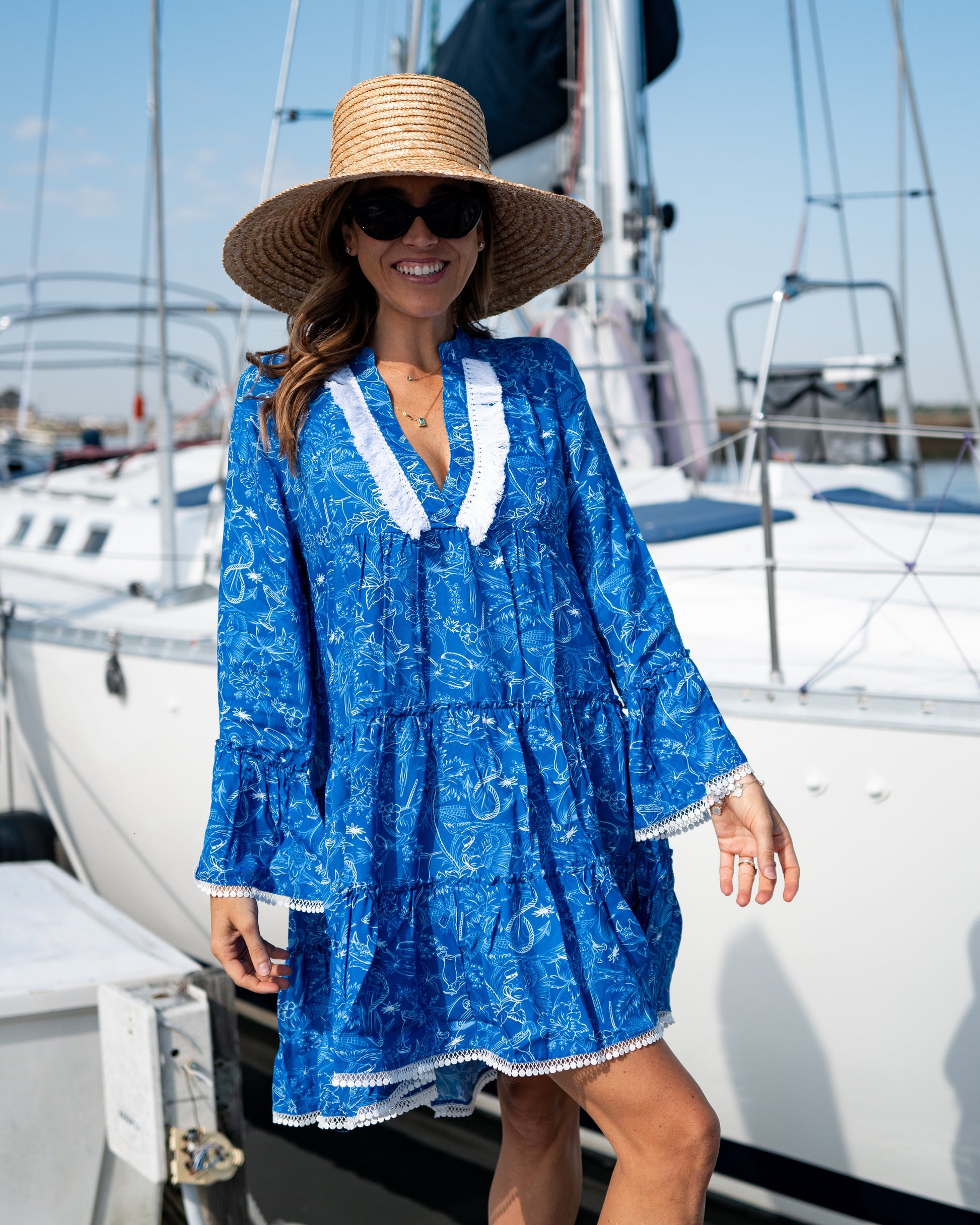 With its beautiful lightweight fabric, deep ocean blue hues and fine trim details, this tiered tunic dress was designed to make a statement on land, and at sea. This chic, effortless pullover dress is so much more than a cover up, and can be dressed up to suit any occasion from your upcoming Caribbean escape to your next relaxing boat day.